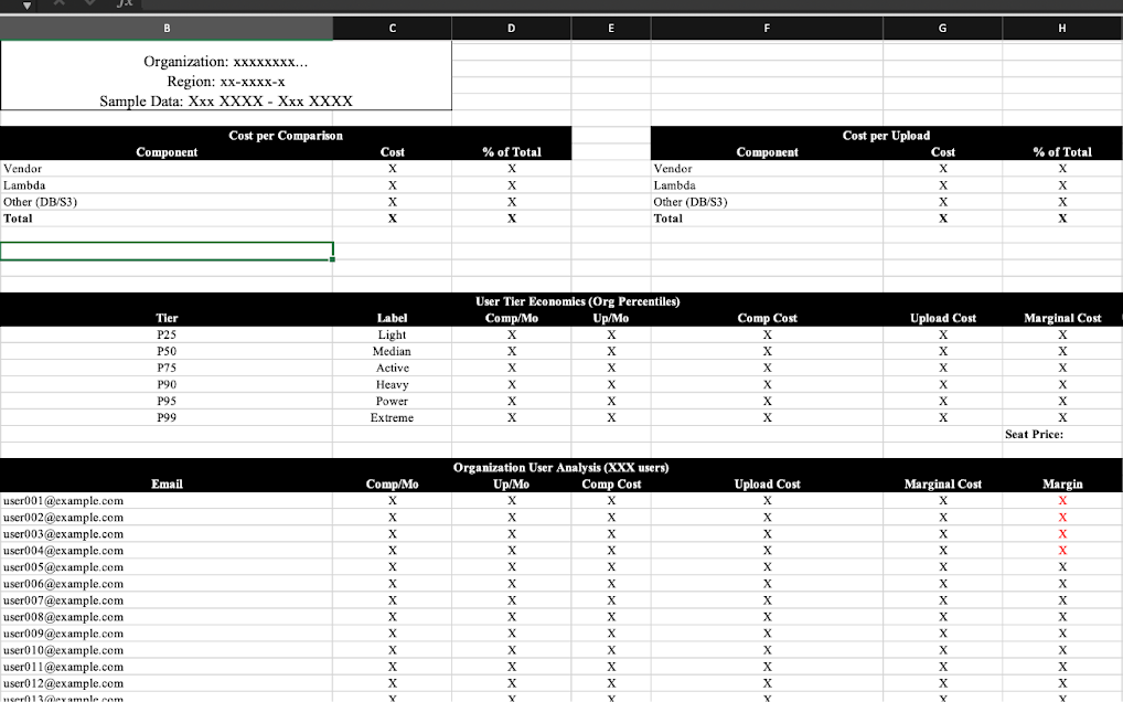 First, it analyzed all of our spend categories and quickly identified the fixed costs. For each variable cost category, it ran a linear regression analysis on-the-fly to correlate our spend to usage increases across the actions like file uploads, comparing documents, etc. It then wrote out its calculated cost/action estimates in a JSON file (a file used for storing data) that the script would use.