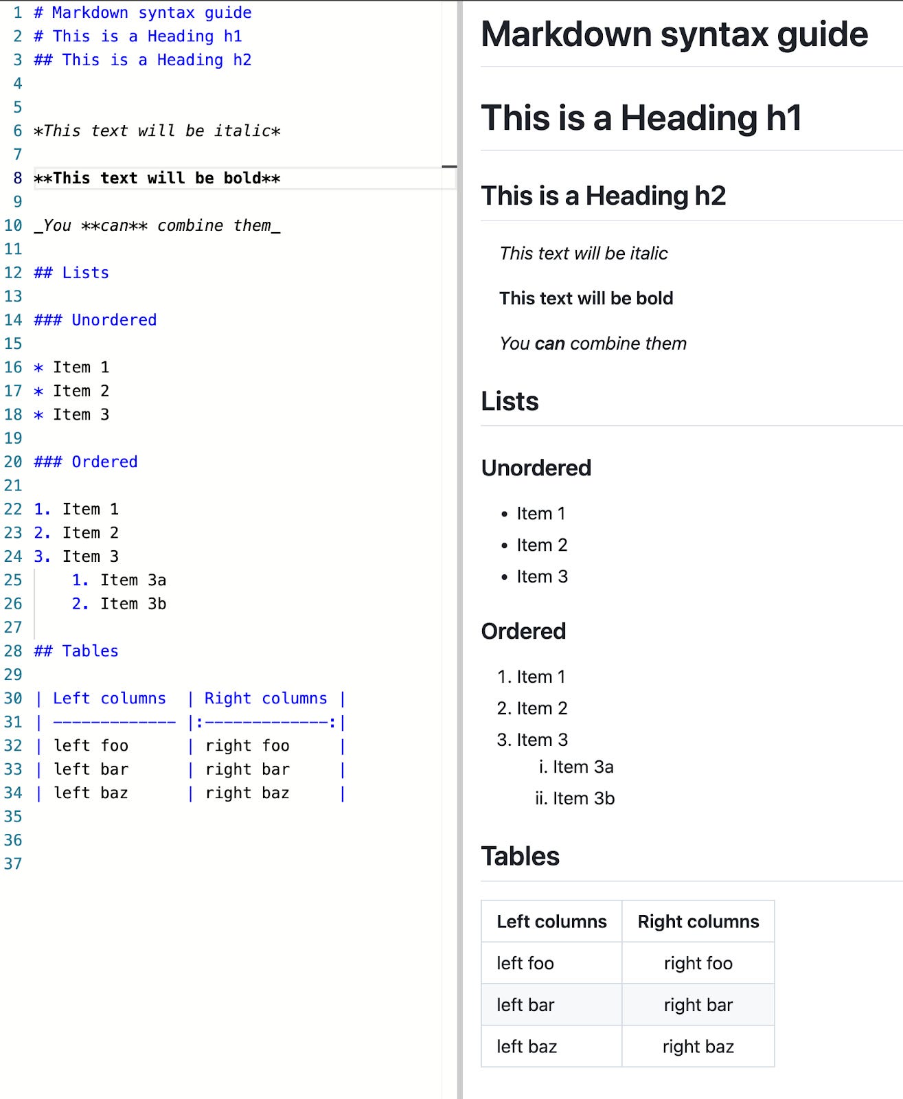 Below is an example of a simple Markdown document with its written form on the left and its rendered form on the right.