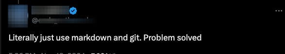 Markdown doesn’t work because of formatting. “But Markdown supports formatting!” the coder cries. That is, in fact, its whole point — the raison d’etre of Markdown is to encode formatting in text. Isn’t that enough?