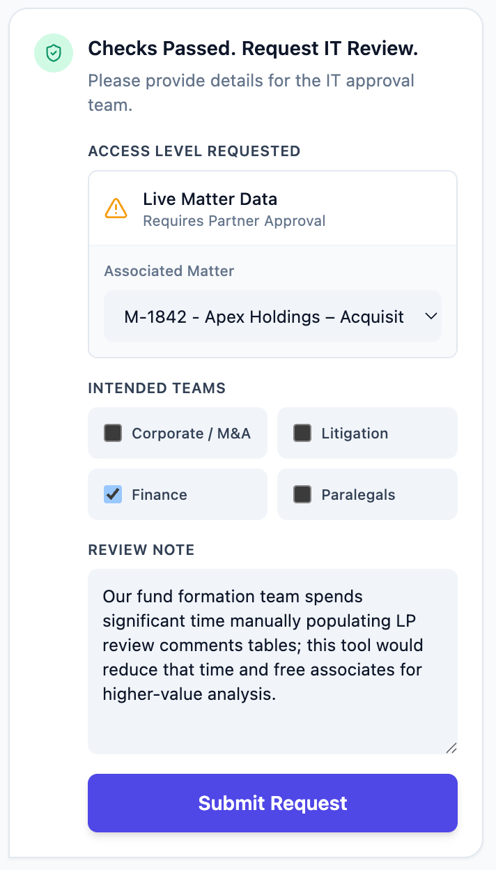 You submit your tool for approval. You describe what it does, who needs access to it, and which matters you need to use it with.