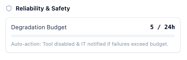 The IT team has allocated a degradation budget of 5 failures for your tool. This means if it fails more than 3 times, it’s automatically taken offline. If the tool ever encounters any kind of issue, a task is automatically assigned to the tool’s owner within the IT team.