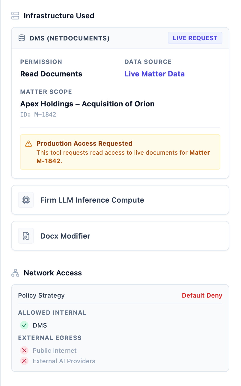 After IT approval, your tool is automatically deployed to an isolated container within your firm’s whitelist-restricted subnet. This means it can only communicate with IP addresses explicitly approved by the IT team.
