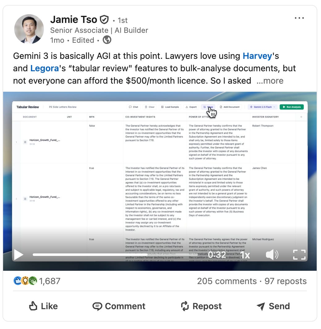 One month ago, an associate at Clifford Chance turned the legal-tech world upside down when he shared that he vibe-coded a popular legal AI workflow in a matter of hours. Jamie Tso’s post sparked a movement. Suddenly, lawyers building their own tools with AI is all anyone can talk about.